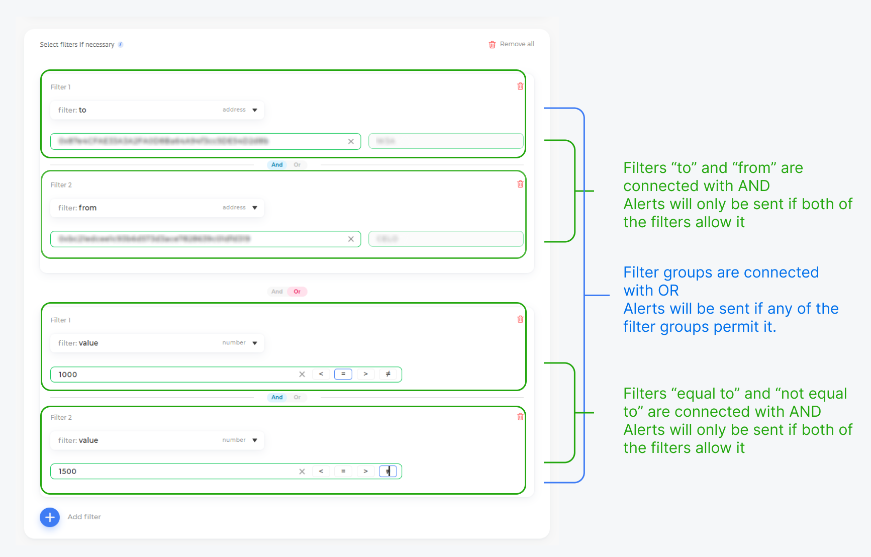 Filters connected by **"AND"** will group them together, and alerts will only be sent if all the filters in the group allow it. On the other hand, filters connected by **"OR"** will create a new filter group, and notifications will be sent if any of the filter groups permit it.
